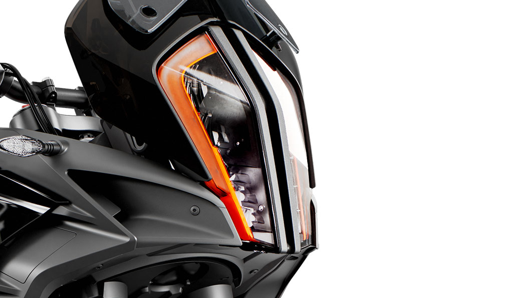 Turning night into day, the LED headlight on the KTM 1290 SUPER ADVENTURE R has been designed to light the way on any adventure. Flanked by cornering and day time running lights. This results in a clean, KTM-distinctive look which provides impeccable illumination with a wide beam pattern to light up the road ahead.