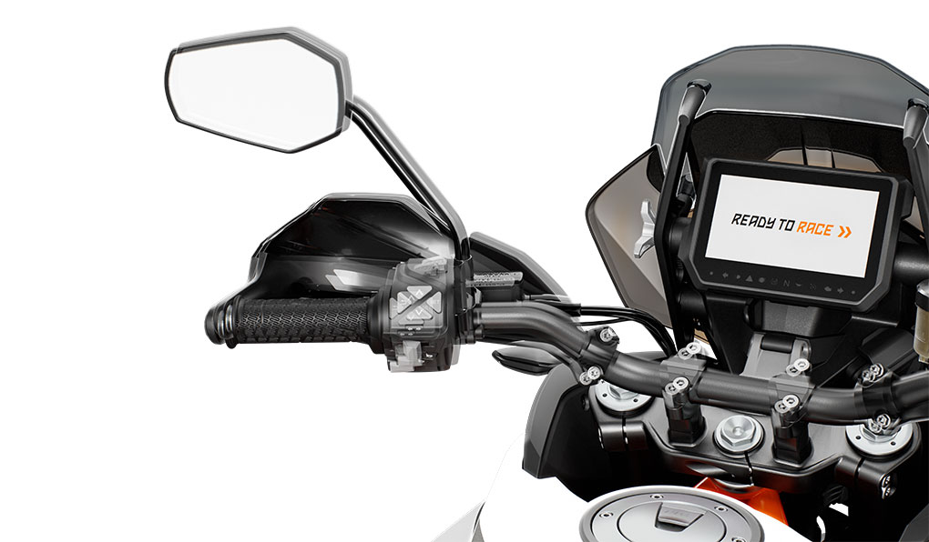 Taking charge at the helm is an all-new scratch-resistant 7-inch TFT display. Unmatched in terms of graphics and readability, adventurers can access information on the fly, quickly and easily without navigating complex menus. This comes thanks to a 6-way switch cube on the handlebar and the new quick select and favorites buttons. Connectivity is also taken care of by way of KTM MY RIDE, which connects via Bluetooth for turn-by-turn navigation, music, and even answering calls. Still catching glare? The TFT screen is tilt-angle adjustable.