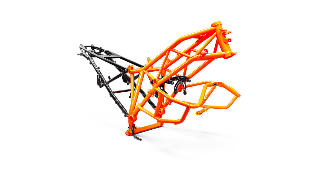 A new, reworked, and lightweight, chrome-molybdenum stainless steel trellis frame featuring laser-cut tubes, combines with forged elements for an ultra-strong component on the KTM 1290 SUPER ADVENTURE R. The steering head has been moved 15 mm rearwards, to shorten the overall frame for improved cornering behavior, while the front engine mount has been rotated forward by 2 degrees to aid in hard acceleration, keeping the front end firmly planted on the ground.